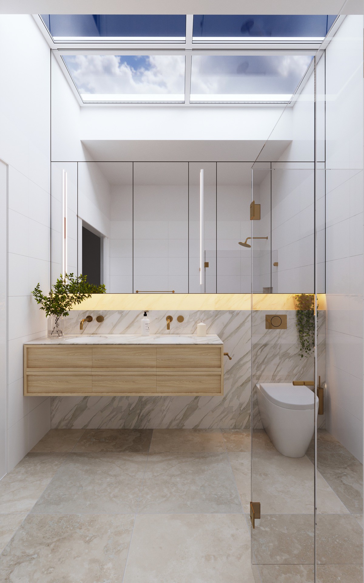 18. Khoảng rộng của cửa sổ trời lợp kính trên phòng ăn hiện đại. Đèn dải làm nổi bật đường viền của quá trình lắp đặt.