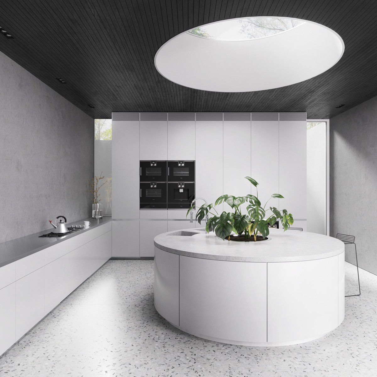 7. Cửa sổ trời đẩy ánh sáng đến căn phòng có không gian mở lớn, đem lại phản xạ tuyệt vời cho chiếc bếp màu trắng bóng loáng phía sau.