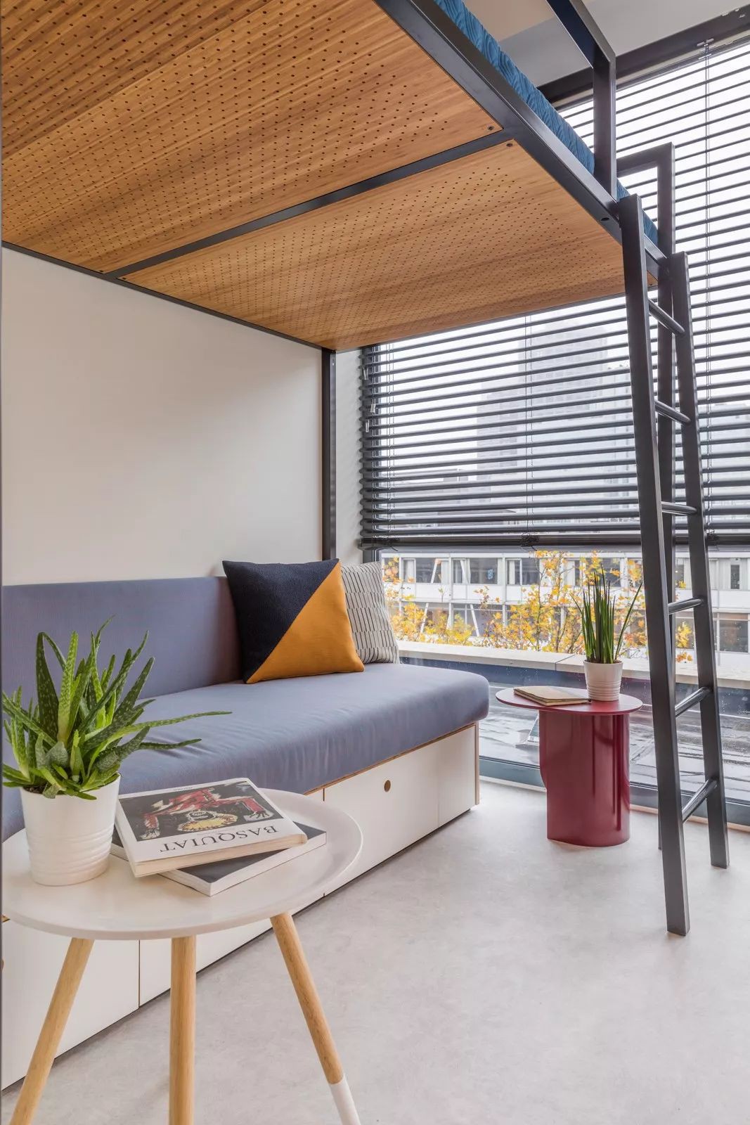 Tay cầm lên gác xép được thiết kế dạng kệ nhỏ kết nối hai khu vực phòng ngủ với bàn làm việc một cách hài hòa, ấn tượng.