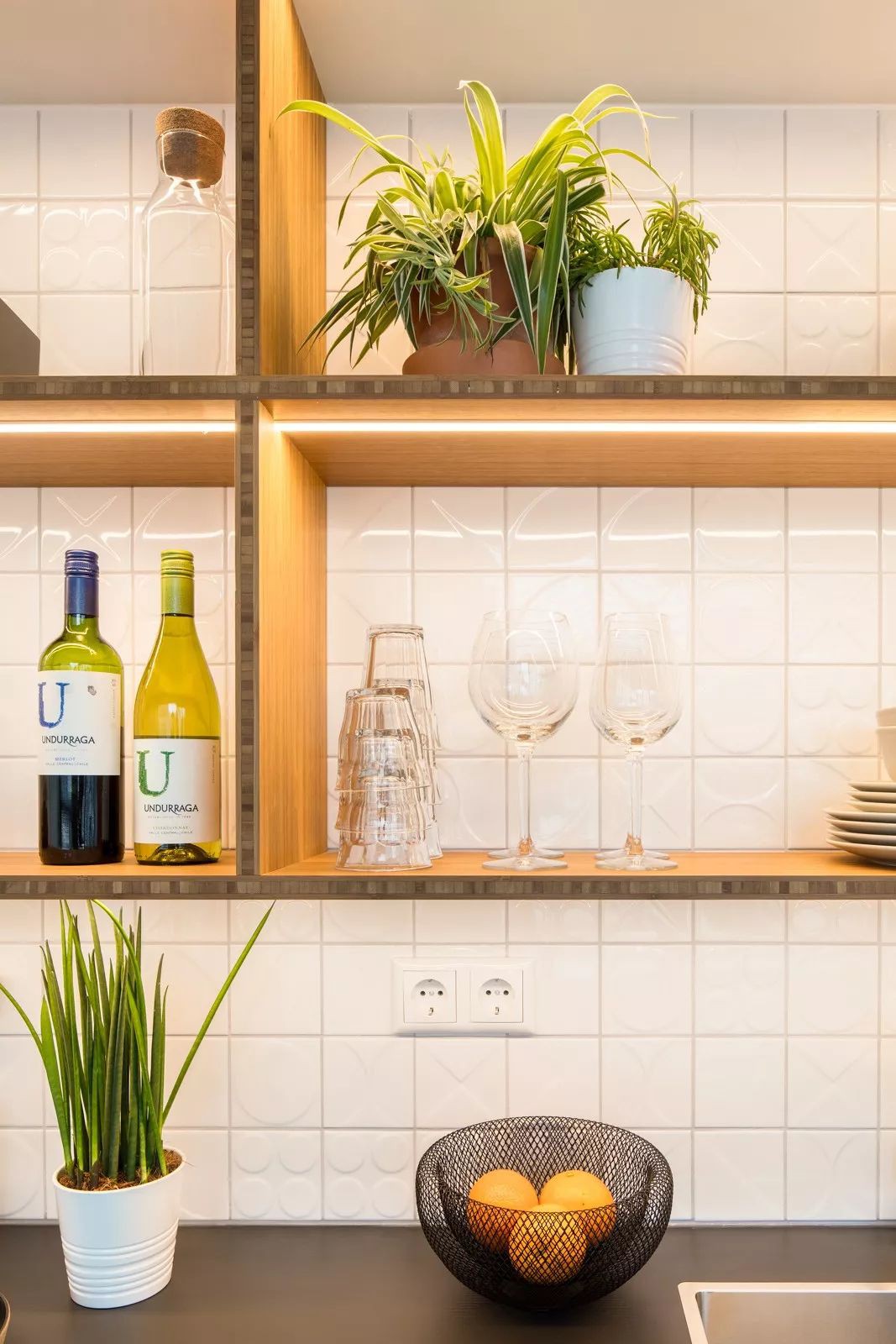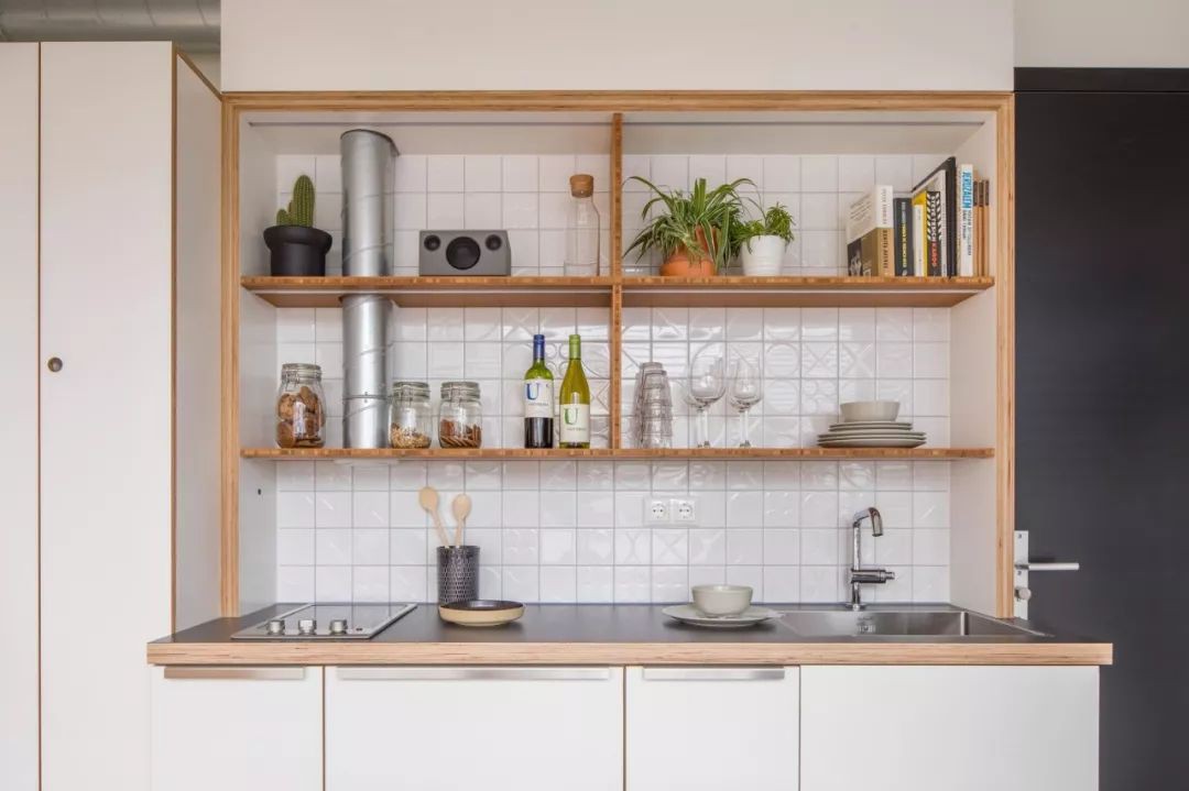 Khu vực bếp nấu cũng được tích hợp khéo léo với bồn rửa đặt ngay cạnh lối vào. Kệ đựng đồ phía trên vừa giúp tăng thêm chức năng lưu trữ vừa giúp căn phòng như gọn thoáng hơn.