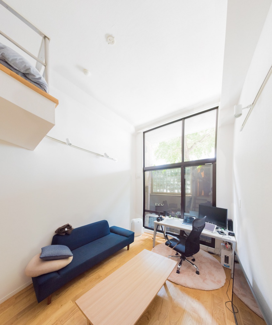 Mặt sàn của căn hộ khá hẹp và dài, thêm ưu thế về chiều cao nên đã được chàng trai trẻ này bố trí khoa học khá nhiều các chức năng cần thiết và hữu dụng cho cuộc sống sinh hoạt thường ngày. Mặt sàn bố trí sofa, bàn trà và đặt ti vi ở bức tường đối diện tạo phòng khách tiện nghi, thoải mái cho những giây phút giải trí.