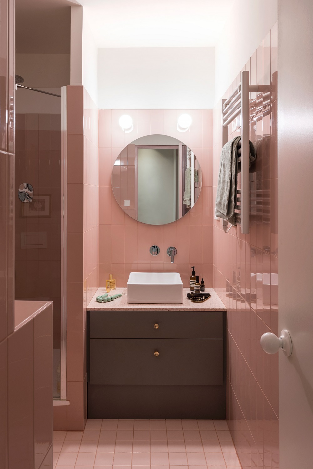 Phòng tắm là minh chứng rõ nhất với bảng màu hồng phấn tràn ngập, kết hợp với màu xám tạo sự tương phản cao.