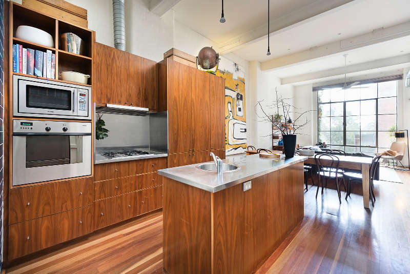 Đảo bếp và hệ thống tủ, đồ gia dụng được chọn chủ yếu là màu gỗ. Những vân gỗ độc đáo của sàn nhà giúp cho góc nhỏ nấu nướng trở nên đặc biệt hơn.