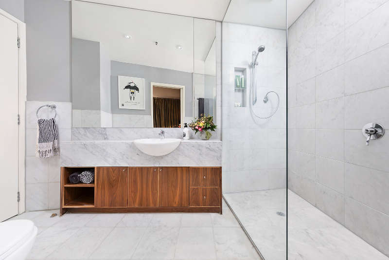 Phòng tắm được thiết kế đơn giản với đá cẩm thạch ốp từ sàn đến tường. Tách biệt phòng tắm đứng bằng lớp kính trong suốt, thêm một chút ấn tượng và hiện đại từ kệ đựng đồ và vật dụng màu trắng tiệp màu với màu nền.