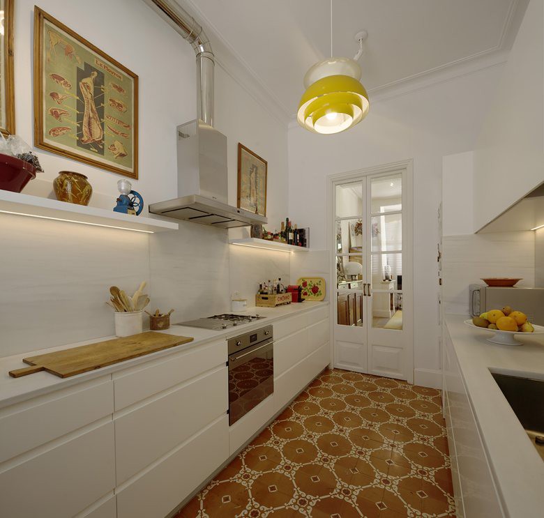 Bếp nấu được bố trí riêng biệt, đặt ngay cạnh phòng ngủ. Góc nấu nướng có diện tích khiêm tốn, tuy nhiên cách sử dụng màu trắng cho toàn bộ tường và nội thất chính, cách chọn lựa nội thất và bài trí theo hình chữ H đã giúp cho không gian nấu nướng như rộng hơn nhiều so với diện tích vốn có. Chủ nhân của ngôi nhà chi cần chọn gạch hoa màu vàng đất là đủ để tạo nên điểm nhấn sắc nét, ấm áp và ấn tượng cho gian bếp nhỏ.