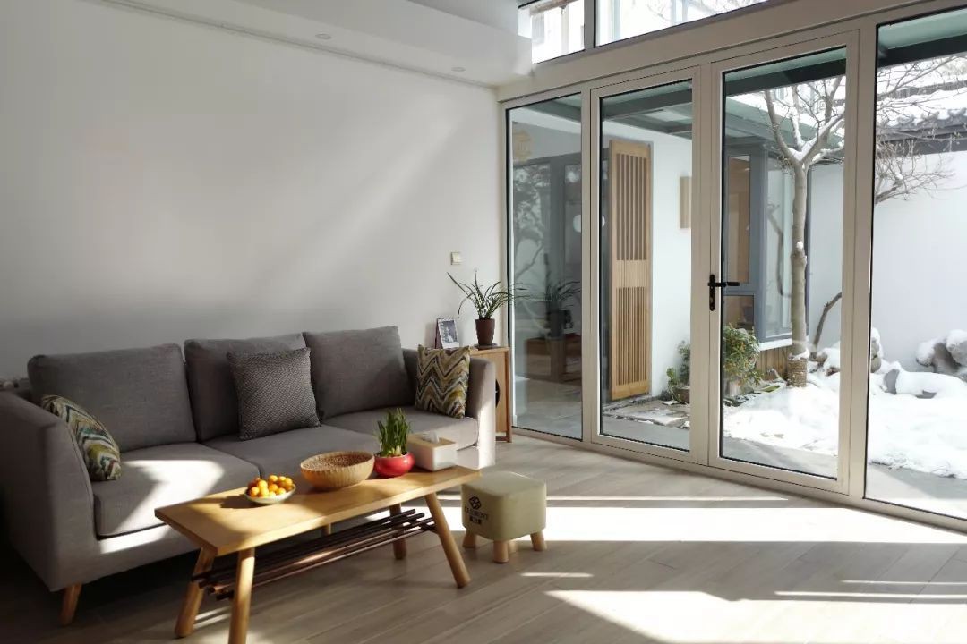 Không gian bên trong cũng thay đổi từ màu sắc đến diện mạo. Những bức tường cũ kỹ đã được loại bỏ bớt, thay bằng kính trượt giúp không gian bên trong nhà được thoáng sáng, tràn ngập ánh nắng và gió trời.