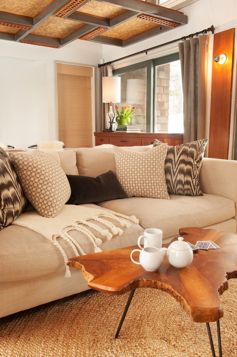 Góc trò chuyện được tiết kiệm diện tích tối đa khi bố trí sofa màu nâu be. Gối tựa êm ái, ấm cúng với bàn trà nhỏ cách điệu bằng gỗ. Thêm vào đó, không gian trò chuyện thanh lịch hơn nhờ đèn chiếu sáng thả trần.