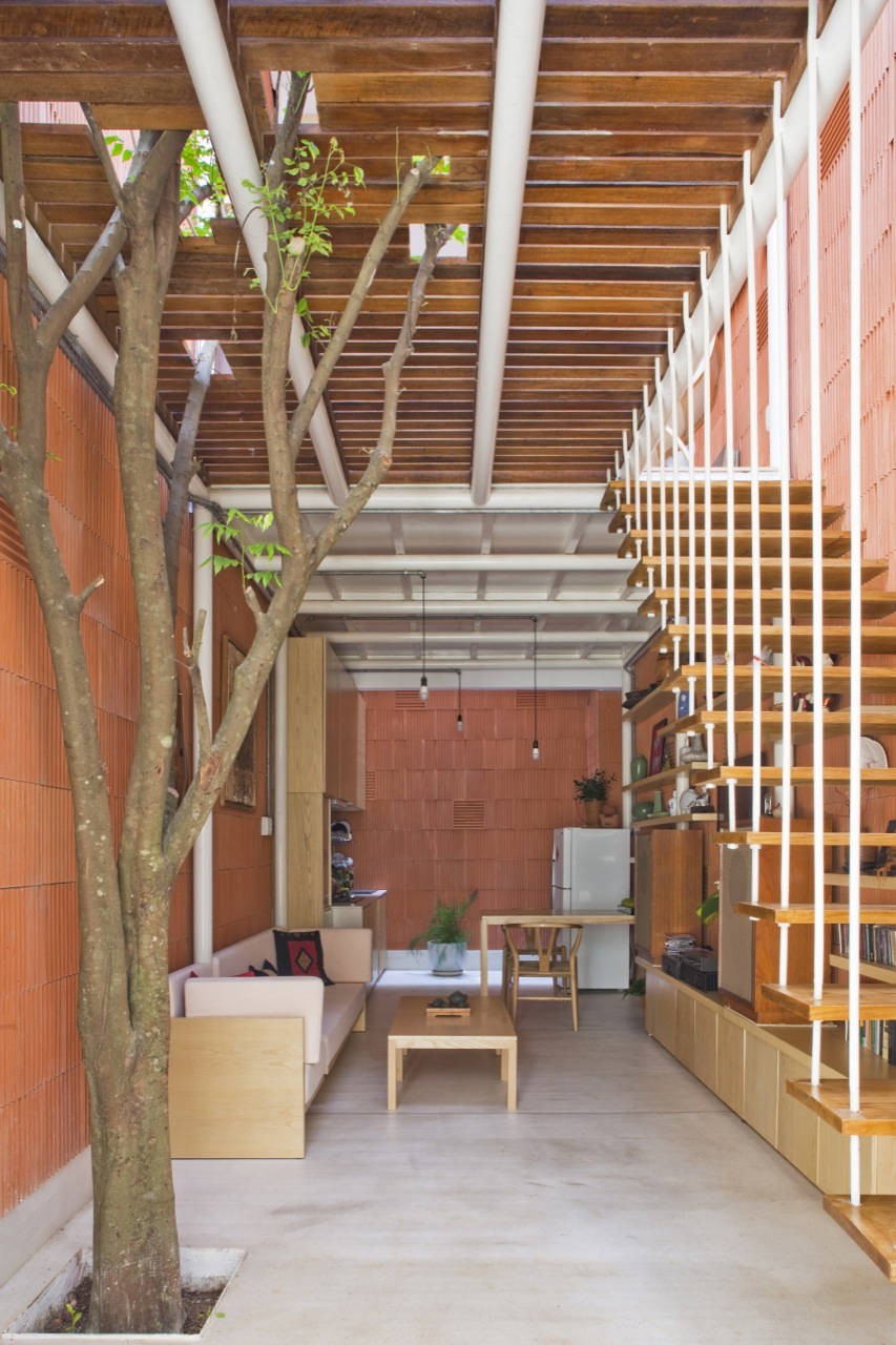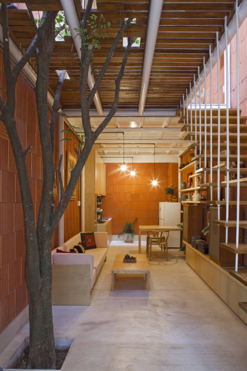 Một trong những quyết định táo bạo nhất của chủ nhà này chính là việc dành không gian cho cây khế ngay giữa nhà. Tuy tốn diện tích, phải xử lý nền và móng nhà kĩ, nhưng bù lại sự xuất hiện của cây xanh đã mang đến cho ngôi nhà sức sống và sự thư giãn hiếm có. Nhất là đối với người phụ nữ đang bước vào tuổi xế chiều, màu xanh của tán cây trong ngôi nhà thực sự là món quà quý giá.