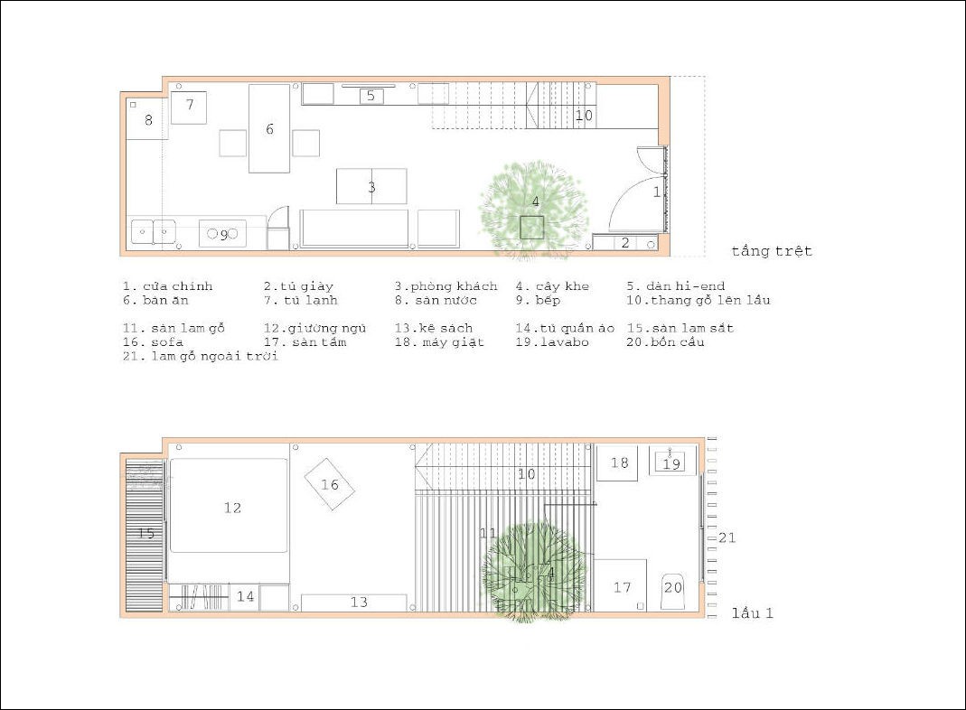 Không gian tầng lầu được dành toàn bộ cho mục đích nghỉ ngơi. Sàn lam gỗ thiết kế đặc biệt với những khoảng hở vừa kết nối giữa phòng ngủ và phòng tắm, đồng thời không ảnh hưởng đến quá trình sinh trưởng của cây khế. Thiết kế thông minh này cùng khoảng trần nhà mái kính rộng nay đã mang dòng chảy của nắng gió, thiên nhiên đi khắp nơi trong căn nhà ống, từ đó đáp ứng được sự an nhiên cũng như tạo bầu không khí lãng mạn mà những người yêu nghệ thuật mong muốn.