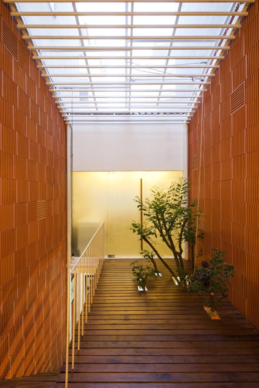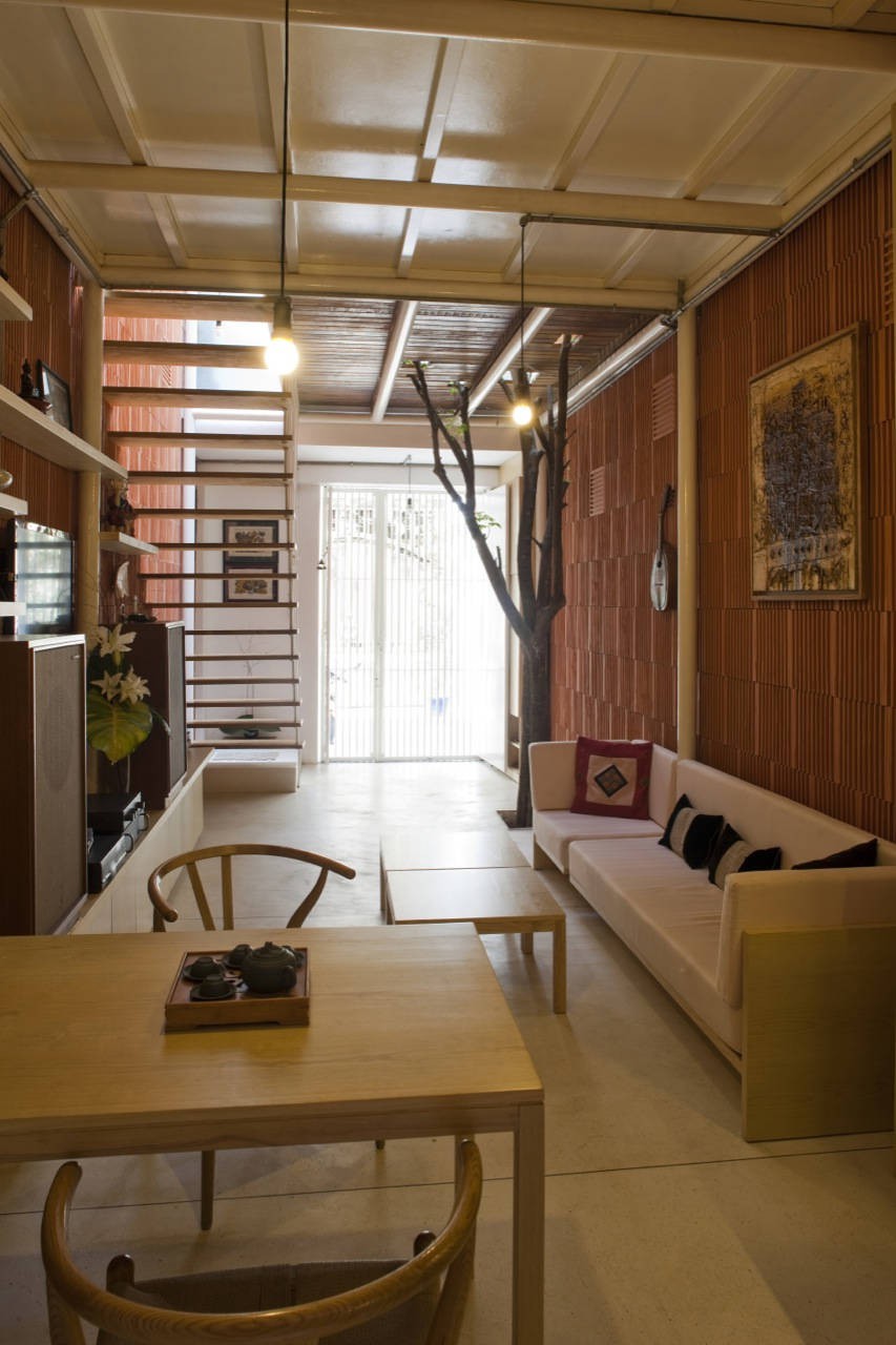 Với xuất phát điểm như vậy, ngôi nhà ống này có rất nhiều điểm khác biệt. Sự tinh tế thể hiện rõ rệt từ mặt tiền với tường kính và lam gỗ ở tầng 2. Ngay cả cách việc hi sinh diện tích cho khoảng sàn thoáng và giếng trời nhằm kéo ánh sáng vào trong nhà cũng có thể xem là lựa chọn táo bạo cho người phụ nữ tuổi trung niên. Tuy nhiên cũng nhờ thế mà ngôi nhà 2 tầng sâu hun hút này không bị lâm vào tình trạng tối tăm thường thấy.