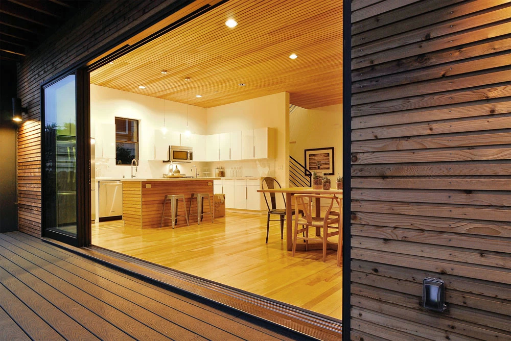 Các cửa kính trong suốt và cửa sắt kéo lên của ngôi nhà đều được lấy ý tưởng từ các ngôi nhà văn phòng của thành phố. Ngoài ra, tường bao của ngôi nhà cũng khá nghệ khi được xây lửng với các ván gỗ bao quanh.