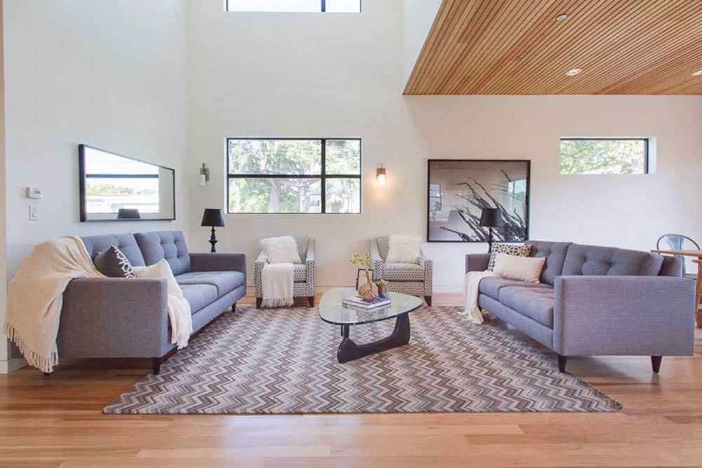 Phòng khách lớn với tông màu xám nhẹ nhàng kết hợp với thảm trải sàn có họa tiết hình học. Ngay phía trên tường của phòng khách chủ nhân ngôi nhà đã khéo léo thiết kế một cửa kính lớn để đón ánh sáng tự nhiên.