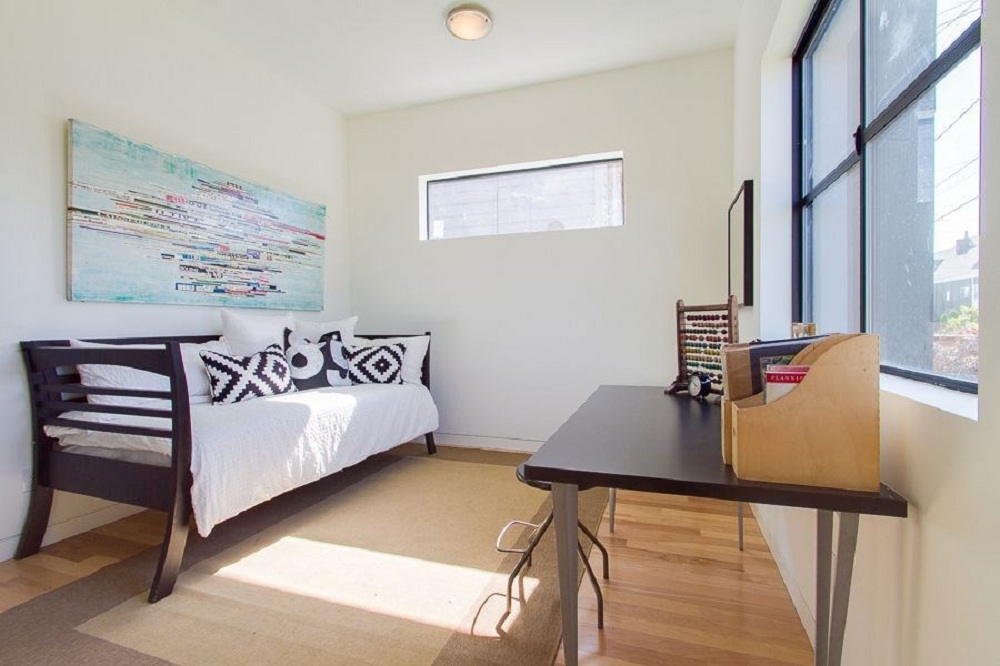 Phía trên tầng hai, không gian đọc sách khá đơn giản được kết hợp thêm một ghế sopha dáng dài giúp chủ nhân có thể thoải mái đọc sách. Cửa sổ lớn giúp đón được ánh sáng tự nhiên vào nhà.